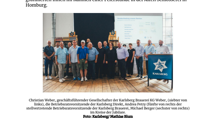 Homburg. Im feierlichen Rahmen ehrte Karlsberg am Freitag, 13. Juni 2025, seine langjährigen Mitarbeiterinnen und Mitarbeiter für ihre 25- bzw. 40-jährige Betriebszugehörigkeit. Christian Weber, geschäftsführender Gesellschafter der Karlsberg Brauerei KG Weber, und Patrik Altherr, Personalleiter des Karlsberg Verbundes, begrüßten die Jubilare und gratulierten Ihnen im Rahmen einer Feierstunde in der Alten Schlosserei in Homburg.